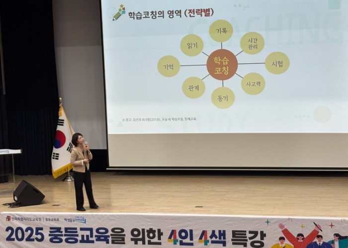 [뉴스노크=김인호 기자] 전북특별자치도교육청은 23일 창조나래 3층 시청각실에서 중등 교장(감), 교사, 교육전문직원 200여 명을 대상으로 ‘2025 중등 학력신장 4인 4색’ 세 번째 특강을 개최했다.