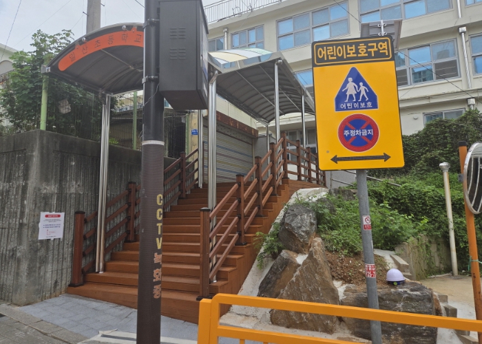 구는 어린이 보호구역의 시인성을 높이기 위해 기존 난간은 어린이 보호구역 전용 난간으로 교체했으며, 미끄럼 방지포장과 안내판을 추가 설치했다.