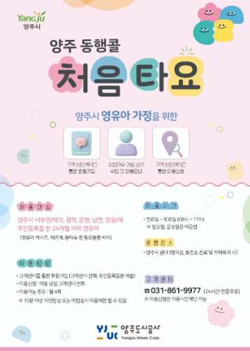 이번 사업은 교통 소외지역 영유아 가구의 이동권을 보장하고 예방접종 등 의료 접근성과 육아 부담을 완화하기 위한 것으로 △영유아 맞춤 전용차량 도입 △여성 운전자 배치를 통한 육아 노하우 공유 등 기존 바우처 택시 등과는 차별화된 방식으로, 양주시가 전국 지자체 중 최초로 추진하는 교통 복지 시책이다.