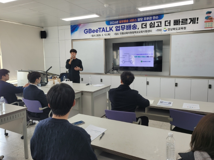 [뉴스노크=김인호 기자] 경북교육청은 12일 안동시에 있는 안동교육지원청 학교교육지원센터 대회의실에서 도내 학교지원센터 담당 장학사, 업무 배송 주무관, 업무 배송 팀장 등 약 80명을 대상으로‘2026 모두를 위한 업무 배송 서비스 운영자 연수’를 개최했다고 밝혔다.