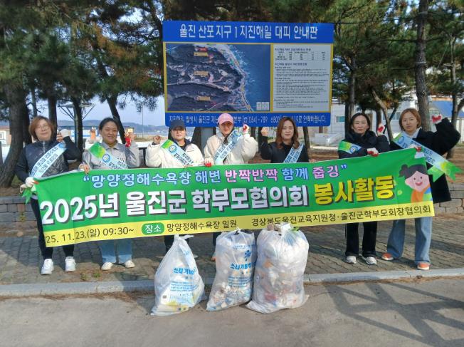 [뉴스노크=김인호 기자] 울진교육지원청은 11월 23일 09시 30분 “먕양해수욕장 해변 반짝반짝 함께 줍깅”이란 슬로건 아래 '2025년 울진군 학부모장협의회 봉사활동'을 실시했다.