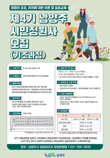 [뉴스노크=김인호 기자] 남양주시는 ‘제4기 남양주시민정원사 양성교육(기초과정)’ 참여자를 모집한다고 24일 밝혔다.