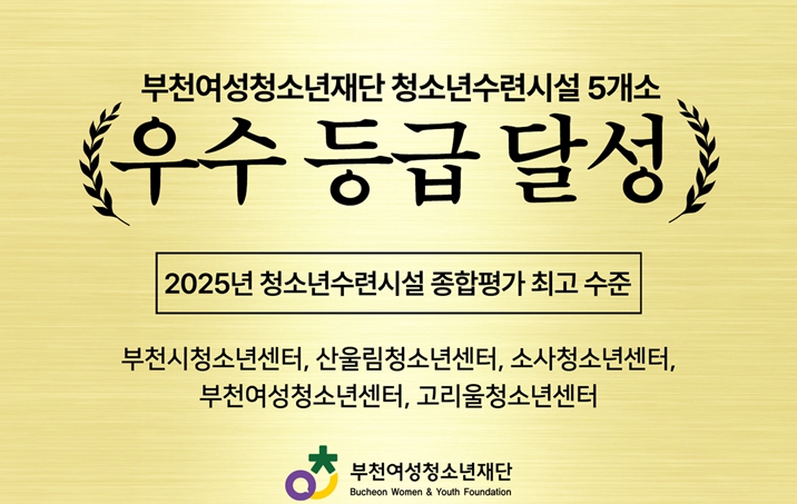 [뉴스노크=김인호 기자] 부천여성청소년재단이 청소년수련시설 5개소(부천시청소년센터, 산울림청소년센터, 소사청소년센터, 부천여성청소년센터, 고리울청소년센터)가 성평등가족부 주관 2025년 청소년수련시설 종합평가에서 5개 시설 모두 최고 수준인 ‘우수’ 등급을 달성하는 쾌거를 이루었다.