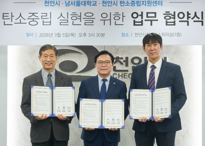 [뉴스노크=김인호 기자] 천안시는 5일 시청 제1소회의실에서 남서울대학교, 천안시 탄소중립지원센터와 ‘탄소중립 시민 저변 확대를 위한 업무협약’을 체결했다고 밝혔다.