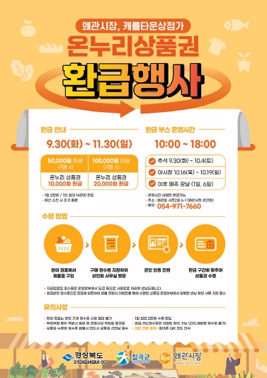 [뉴스노크=김인호 기자] 칠곡군은 전통시장 활성화와 지역경제 활력 제고를 위해 9월 30일(화)부터 11월 30일(일)까지 전통시장 구매 고객을 대상으로 온누리상품권 환급행사를 진행한다.