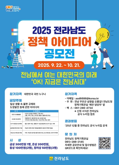 [뉴스노크=김인호 기자] 전라남도가 새 정부의 실용주의 기조에 맞춰 ‘생활 속 불편을 찾고 이를 개선할, 지역의 미래를 먹여 살릴 정책’을 주제로 ‘2025년 전라남도 정책 아이디어 공모전’을 개최한다.