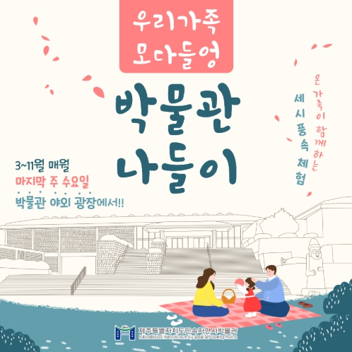 [뉴스노크=김인호 기자] 제주민속자연사박물관이 오는 3월부터 11월까지 매월 마지막 주 수요일 ‘문화가 있는 날’을 맞아, 제주의 세시풍속을 테마로 한 체험 프로그램 ‘우리 가족 모다들엉 박물관 나들이’를 운영한다.