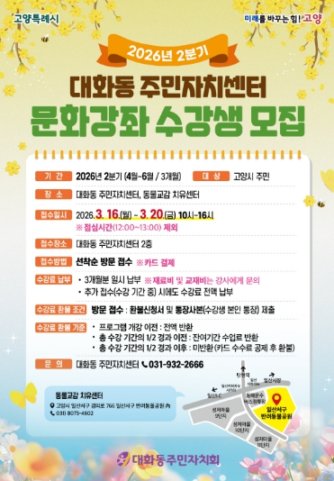 [뉴스노크=김인호 기자] 고양특례시 일산서구 대화동 주민자치회는 주민들의 문화적 욕구를 충족하고 삶의 질을 높이기 위해 오는 3월 16일부터 20일까지 ‘2026년 2분기 문화강좌’ 수강생을 모집한다.
