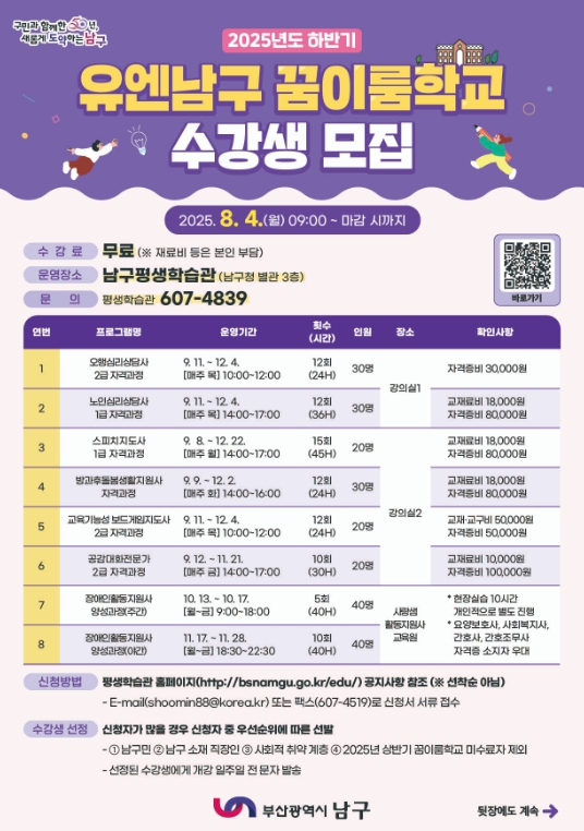남구 주민이면 누구나 무료로 수강할 수 있으며, 자세한 사항은 부산 남구평생학습관 홈페이지를 참고하면 된다. (문의 : 남구평생학습관 )