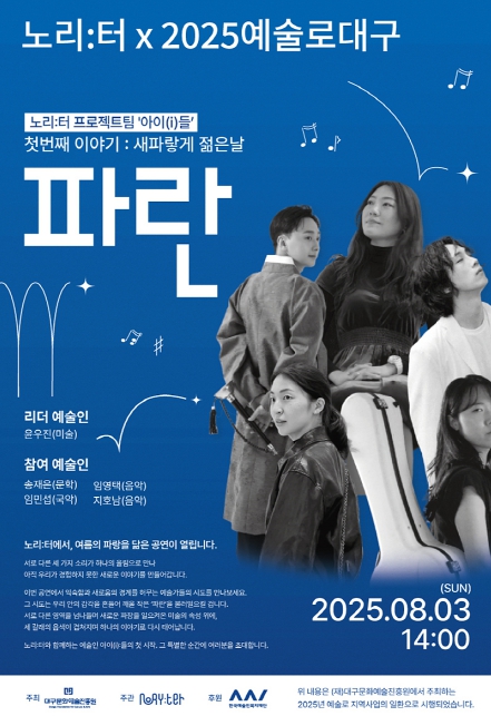 [뉴스노크=김인호 기자] 대구문화예술진흥원은 ‘2025 예술인파견지원사업–예술로 대구’의 일환으로 8월 3일 오후 2시, 복합문화공간 ‘노리:터’에서 프로젝트 공연 ‘파란’을 개최한다고 밝혔다.