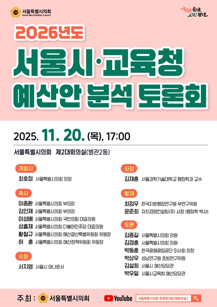 [뉴스노크=김인호 기자] 서울특별시의회는 2025년 11월 20일 오후 5시, 서울특별시의회 제2대회의실에서 '2026년도 서울시·교육청 예산안 분석 토론회'를 개최한다.