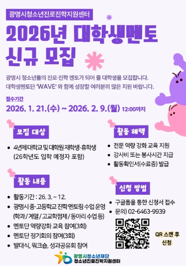 [뉴스노크=김인호 기자] 광명시청소년재단 청소년진로진학지원센터는 관내 중·고등학교 청소년 대상 학과 멘토링 운영을 위해 ‘2026년 대학생 멘토단(wave)’을 모집한다고 밝혔다.
