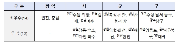 종합점수 산정결과, 인천, 충남 등 광역 지자체 2곳, 경기 수원, 전남 곡성, 대구 수성 등 기초 지자체 24곳 등 총 26곳이 우수 지방정부로 선정됐다.