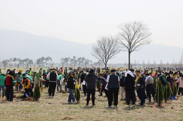 이날 참가자들은 황산공원에서 이팝나무 외 4종, 총 1,500주를 심으며 도심 속 녹지 확충과 탄소중립 실천의 의미를 나눴다. 아울러 ‘내 나무 갖기 행사(친환경화분 1,500개)와 삼색 소원지 달기’ 등 시민 체험 프로그램도 함께 운영해 식목일의 의미를 보다 쉽고 친근하게 공감할 수 있도록 했다.