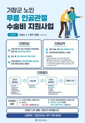 [뉴스노크=김인호 기자] 기장군은 오는 2026년부터 부산시 최초로 ‘어르신 무릎인공관절 수술비 지원사업’을 확대 시행한다고 23일 밝혔다.