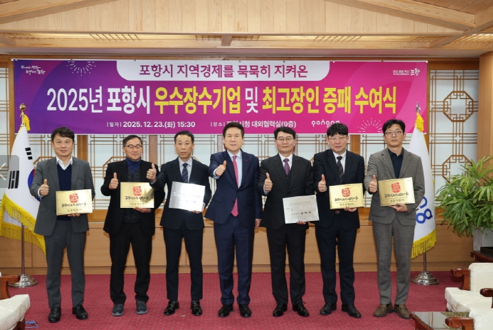 [뉴스노크=김인호 기자] 포항시는 23일 시청 대외협력실에서 ‘2025년 포항시 우수장수기업 및 최고장인 증패수여식’을 개최했다.