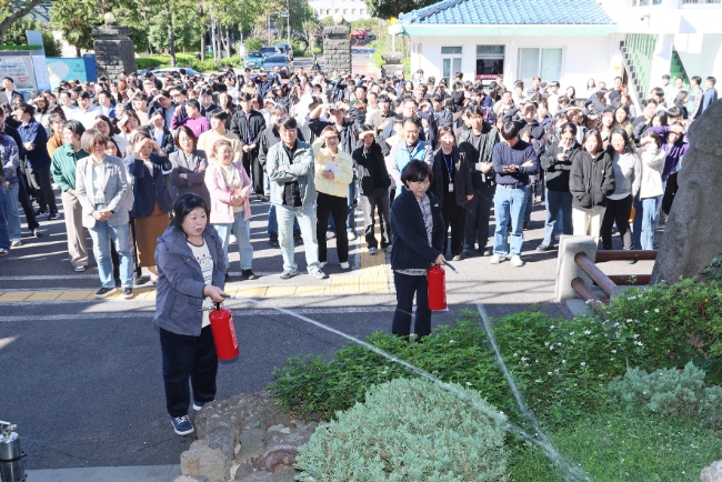 장옥영 총무과장은 “제주시청은 민원인과 직원 모두의 안전을 동시에 책임져야 하므로 신속한 대피와 초기 진화 능력이 무엇보다 중요하다”며, “훈련 이후에도 청사 내 소방시설 위치 등을 다시 확인해 만일의 재난 상황에도 침착하게 대응할 수 있도록 지속적인 관심과 준비를 부탁드린다”고 당부했다.