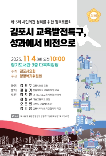 [뉴스노크=김인호 기자] 김포시의회는 김포시 교육발전특구의 추진 성과를 점검하고 향후 비전과 정책 방향을 모색하기 위해 오는 11월 4일 장기도서관 3층 다목적강당에서 정책토론회를 개최한다.