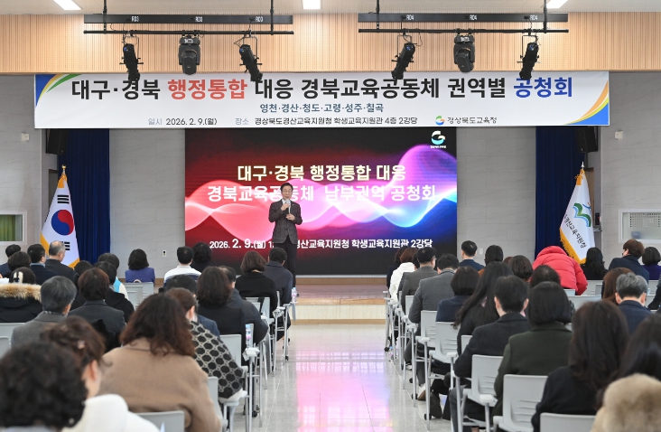 [뉴스노크=김인호 기자] 경북교육청은 9일 경산시에 있는 경산교육지원청 학생교육지원관에서 남부권역(경산.영천.청도.고령.성주.칠곡) 교직원과 학부모 200여 명이 참석한 가운데 ‘대구-경북 행정통합 대응 경북교육공동체 권역별 공청회’ 첫 일정을 개최했다고 밝혔다.