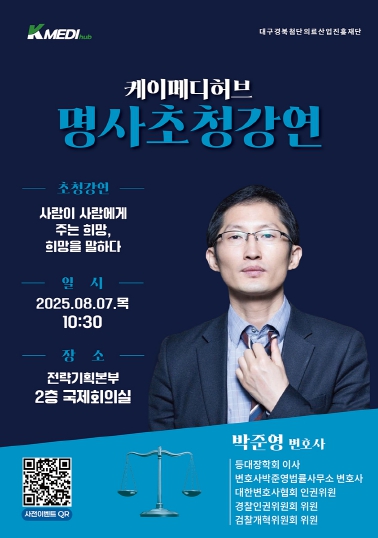 박구선 케이메디허브 이사장은 “재단 직원과 지역민을 대상으로 희망을 줄 수 있는 강연을 준비했다”며, “이번 강연을 통해 공감과 위로를 받는 시간을 마련하길 바란다”고 말했다.