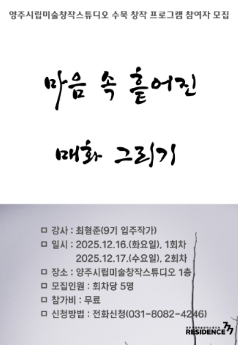 [뉴스노크=김인호 기자] 양주시립미술관이 오는 12월 17일과 18일 이틀간, 양주시립미술창작스튜디오 9기 입주작가 최형준이 진행하는 창작 수묵화 프로그램 《마음 속 흩어진 매화 그리기》의 참여자를 모집한다.