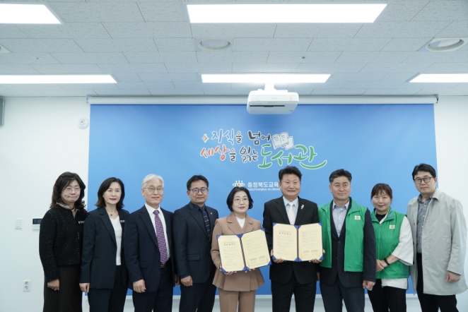 [뉴스노크=김인호 기자] 충청북도교육청 직속기관 교육도서관(관장 노재경)은 25일 오후 2시, 도서관 5층 영상회의실에서 새마을문고중앙회 청주시지부(회장 김대형)와 지역사회 독서문화 활성화를 위한 업무협약(MOU)을 체결했다.