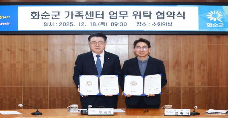 [뉴스노크=김인호 기자] 화순군은 18일 화순군청 소회의실에서 (사)다사랑건강가정복지협회(회장 김종식)와 화순군 가족센터 업무 위탁 협약을 체결하고, 가족 지원 정책의 안정적 추진과 지역사회 돌봄 기반 확충에 나섰다고 밝혔다.