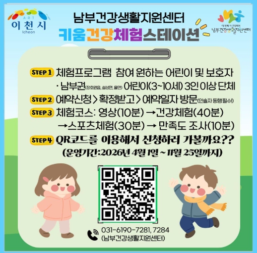 운영은 4월부터 11월까지 매주 수요일, 센터 2층 어린이건강체험존에서 진행되며, 남부권 3~10세 어린이를 대상으로 3인 이상 예약제로 운영된다.