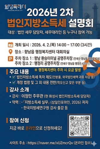 [뉴스노크=김인호 기자] 화성특례시 만세구청이 지난 1차 설명회의 뜨거운 관심에 힘입어, 오는 4월 2일 오후 2시 향남읍 행정복지센터에서 ‘2차 법인지방소득세 설명회’를 개최한다.