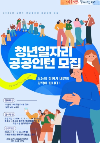 [뉴스노크=김인호 기자] 이천시는 2026년 1월 5일부터 1월 16일까지 ‘청년일자리 공공인턴사업’의 상반기 참여자 47명을 모집한다.