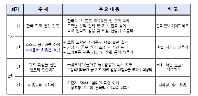 이번 교육은 한국어 소통이 가능한 학부모 소규모 그룹을 형성해 온·오프라인 방식을 병행하여 운영한다.