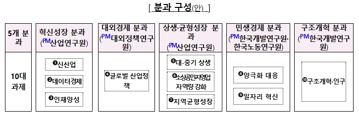 오늘 회의에서는 경인사연 소속 연구기관들이 집중 연구할 경제 대도약 10대 과제를 선별해 5개 분과로 편성하고 분과별 주관 연구기관(PM)을 지정했다. 아울러 연구 성과가 실제 정책으로 이어질 수 있도록 기재부를 중심으로 관계부처가 분과별 논의에 적극 참여해 연구기관들과 의견을 교환하도록 할 계획이다.
