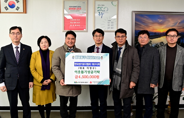 윤석준 동구청장은 “매년 변함없이 이웃사랑을 실천해 주시는 한국전기공사협회 대구시회에 깊이 감사드린다”며 “기탁된 성금은 소외된 이웃들에게 소중히 전달하겠다”고 말했다.