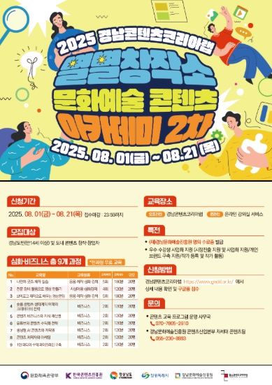[뉴스노크=김인호 기자] 경남도와 경남문화예술진흥원은 8월 21일까지 ‘2025 경남콘텐츠코리아랩 별별창작소 아카데미 2차(심화과정)’ 교육생을 모집한다고 밝혔다.