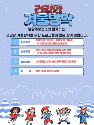 [뉴스노크=김인호 기자] 남양주보건소는 겨울방학 동안 관내 초등학생들을 대상으로‘초등학생이 건강한 겨울방학’프로그램을 이달 9일부터 내달 6일까지 4주간 운영한다고 7일 밝혔다.