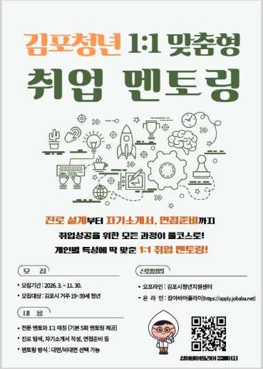 [뉴스노크=김인호 기자] 김포시는 청년들의 취업 역량 강화를 위해 ‘2026년 김포 청년 1:1 맞춤형 취업 멘토링’ 참여자를 모집한다. 모집 기간은 3월 5일부터 11월 30일까지이며, 모집 인원 초과 시 조기 마감될 수 있다.