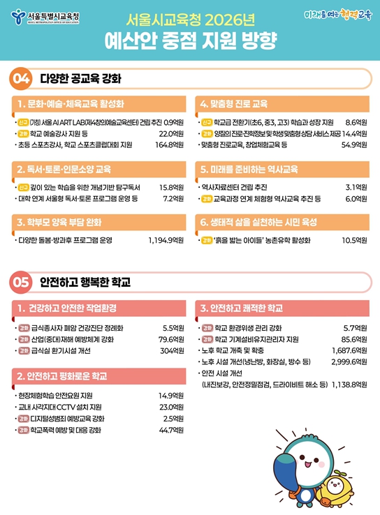 세출 예산은 △맞춤형 교육으로 교육격차 해소 △AI 교육 등 미래역량교육 강화 △학생·교원 마음건강 증진 △다양한 공교육 강화 △안전하고 행복한 학교 지원에 중점을 두었다.