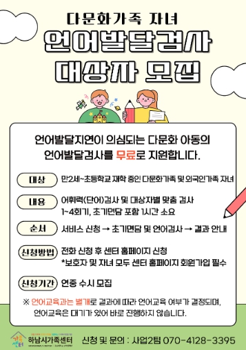 ‘다문화가족자녀 언어발달지원사업'은 하남시가족센터 홈페이지 회원가입 후 신청 가능하며, 자세한 사항은 센터로 문의하면 안내받을 수 있다.