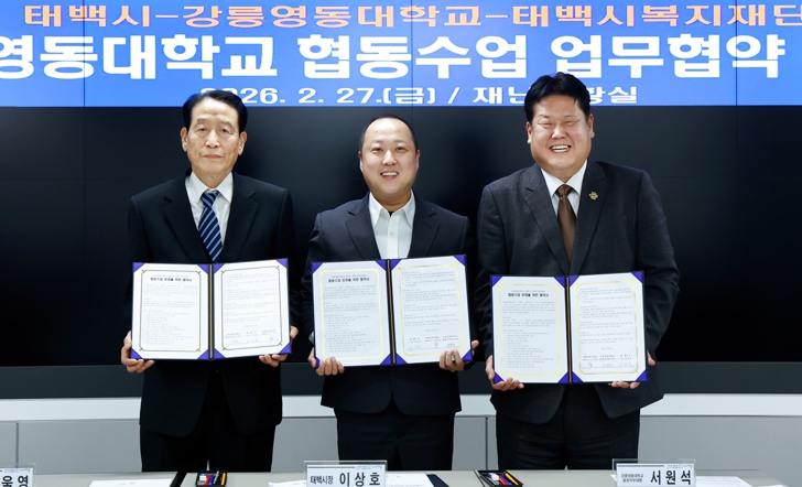 [뉴스노크=김인호 기자] 태백시는 2월 27일 강릉영동대학교, 태백시복지재단과 함께 지역 인재 양성과 현장 기반 교육 강화를 위한 협동수업 운영 업무협약을 체결했다고 밝혔다.