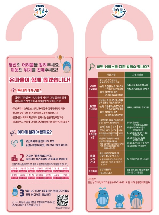 남구는 조사 결과에 따라 기초생활보장과 긴급지원, 차상위 지원 등 공적급여 연계를 비롯해 민간서비스와 지역특화사업 등 다양한 자원을 동원해 위기가구를 지원할 계획이다.
