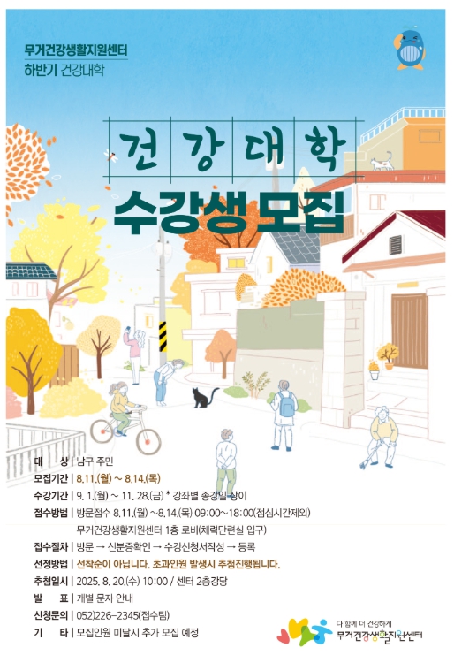 [뉴스노크=김인호 기자] 울산 남구보건소 무거건강생활지원센터는 11일부터 ‘2025년 하반기 건강대학’ 수강생 모집을 시작한다고 밝혔다.