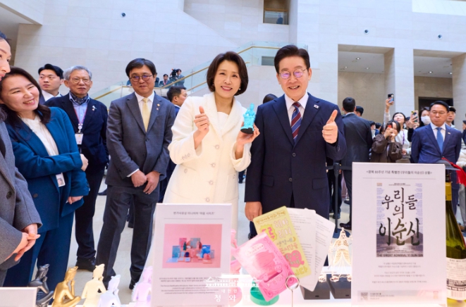 특히 우리나라의 대표 유산인 반가사유상에 엄지척, 볼하트, 손하트 등의 포즈를 더해 현대적으로 재해석한 제품을 흥미롭게 보던 이 대통령은 분홍색 볼하트 반가사유상과 똑같은 자세로 볼하트를 만들어 지켜보던 이들에게 큰 웃음을 안겼다.