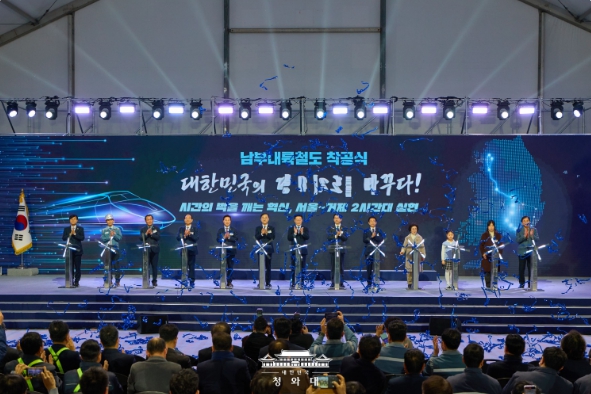 이 대통령은 이날 오전 남부내륙철도 착공식에서 기념사를 통해 "남부내륙철도가 마침내 착공한다. 이 뜻깊은 착공식을 온 국민과 함께 진심으로 축하드린다"며 이 같이 밝혔다.