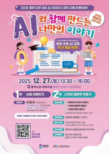 [뉴스노크=김인호 기자] 충청북도는 오는 12월 27일 13:30 충북도청 대회의실에서 도내 초등학생(3~6학년)과 학부모 200여명을 대상으로 ‘AI 웹툰 교육(중부권 2차)’을 진행한다고 밝혔다. 이번 교육은 북부권(충주), 남부권(옥천), 중부권 1차(청주)에 이어 2025년 마지막으로 개최되는 도내 AI 창작 체험 프로그램이다.