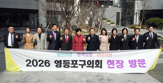 | ▲ 영등포구의회는 제268회 임시회 기간 중인 24일 현장방문을 실시했다. 행정위원회와 사회건설위원회가 공동으로 방문한 여의도 브라이튼 도서관에서 의원들이 기념촬영을 하고 있다. |
