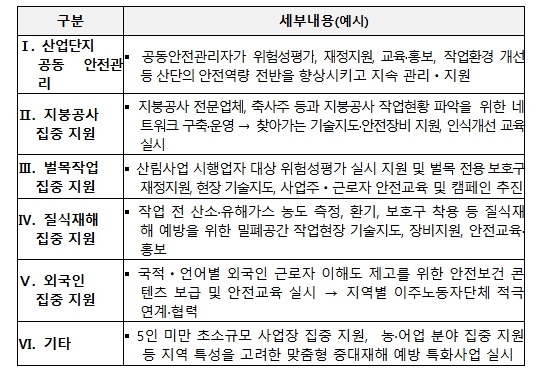 지방정부는 작은 사업장이 밀집되어 있는 산업‧농공단지에 대한 공동안전관리, 재해 발생 가능성이 높은 지붕공사‧벌목작업‧밀폐작업 집중지원, 외국인노동자 지원 등 사업유형별로 구체적 지원 대상과 내용, 기준을 자유롭게 기획하여 신청할 수 있다.
