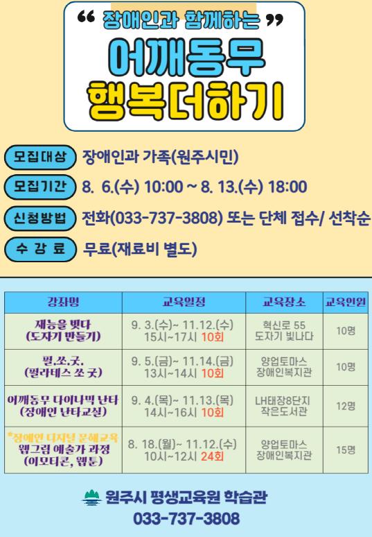 [뉴스노크=김인호 기자] 원주시 평생교육원 학습관은 8월 13일까지 장애인과 함께하는 ‘어깨동무 행복 더하기’ 과정 수강생을 모집한다.
