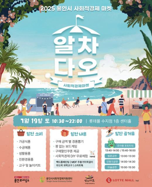 [뉴스노크=김인호 기자] 용인특례시는 7월 19일 롯데몰 수지점에서 사회적경제기업 제품을 소개하고 판매하는 제3회 ‘롯데몰 마켓 알차다오’를 개최한다.