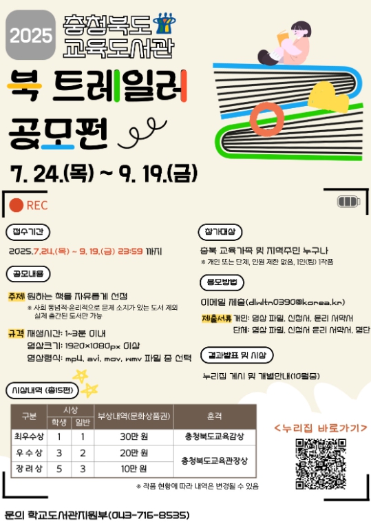 [뉴스노크=김인호 기자] 충청북도교육청 직속기관 교육도서관은 31일, 영상 콘텐츠를 통해 도서관 및 독서문화 활성화를 도모하기 위한 '2025년도 북 트레일러 공모전'을 운영한다고 밝혔다.