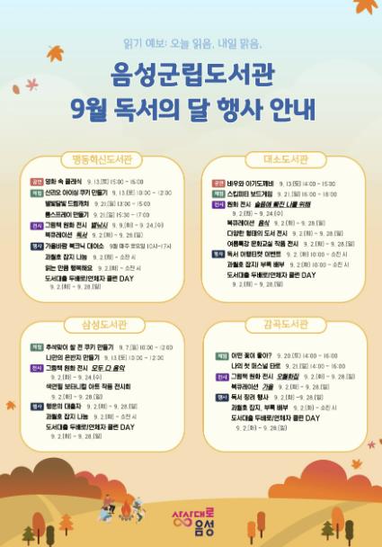 [뉴스노크=김인호 기자] 음성군립도서관(맹동혁신,대소,삼성,감곡)에서는 9월 한 달간 독서의 달을 맞이해 ‘읽기예보: 오늘 읽음, 내일 맑음.’이라는 주제로 지역 주민 대상 각종 독서·문화 행사를 개최한다.